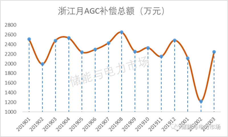2019年1月-2020年3月間,浙江省的AGC調頻輔助服務補償額平均為2262萬元,除個別月份出現(xiàn)比較低的值外,基本穩(wěn)定在2000萬以上,最高為2019年8月,2651萬元。