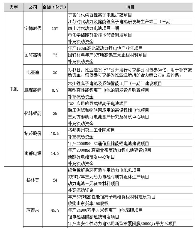 4、重視研發(fā)儲(chǔ)備與技術(shù)升維。除了擴(kuò)產(chǎn)并購(gòu)?fù)?,包括寧德時(shí)代、先導(dǎo)智能、鵬輝能源、璞泰來、華友鈷業(yè)等企業(yè)均在募集資金用于前沿技術(shù)研發(fā)項(xiàng)目。