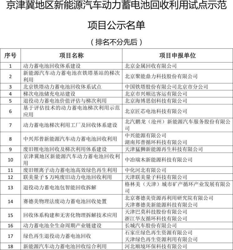 2019年6月14日,北京市經(jīng)濟(jì)和信息化局發(fā)布了《關(guān)于京津冀地區(qū)新能源汽車動(dòng)力電池回收利用試點(diǎn)示范項(xiàng)目》的公示,共包含21家申報(bào)單位申報(bào)的18個(gè)試點(diǎn)示范項(xiàng)目,其中包含中國(guó)鐵塔北京分公司的“北京鐵塔動(dòng)力蓄電池回收體系試點(diǎn)”、北京市興順達(dá)客運(yùn)有限公司的“梯次電池儲(chǔ)充電站建設(shè)”、北京匠芯電池科技有限公司的“基于評(píng)估技術(shù)的動(dòng)力蓄電池梯次利用示范應(yīng)用”等。