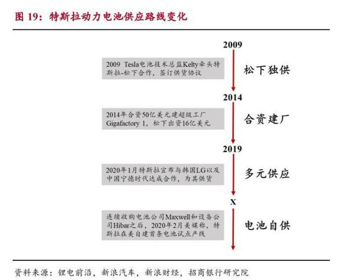 二線企業(yè)仍蘊(yùn)藏生機(jī),未來有望形成一超多強(qiáng)的格局。作為新能源汽車行 業(yè)的領(lǐng)軍企業(yè),特斯拉對動力電池供應(yīng)商的選擇經(jīng)歷四個階段:(1)松下獨(dú) 供:發(fā)展初期,特斯拉從技術(shù)與品質(zhì)優(yōu)先的角度出發(fā),選擇松下作為其唯一的 供應(yīng)商;(2)合資建廠:發(fā)展中期,特斯拉動力電池需求旺盛,與松下合資 建立超級工廠,形成深度綁定關(guān)系;(3)多元供應(yīng):產(chǎn)能爬坡期,與松下關(guān) 于產(chǎn)能擴(kuò)建與電池成本等方面矛盾凸顯,特斯拉從成本、品質(zhì)、規(guī)模優(yōu)先的角 度引入 LG 和寧德時代;(4)電池自供:隨著 2019 年先后收購電池公司 Maxwell 和電池設(shè)備公司 Hibar,2020 年 2 月自建電池試點(diǎn)產(chǎn)線,未來特斯拉 電池自供的規(guī)劃逐漸清晰。其他新能源汽車企業(yè)對動力電池供應(yīng)商的選擇,大 概率也會經(jīng)歷上述四個階段,屆時對動力電池的格局有著較大的影響。