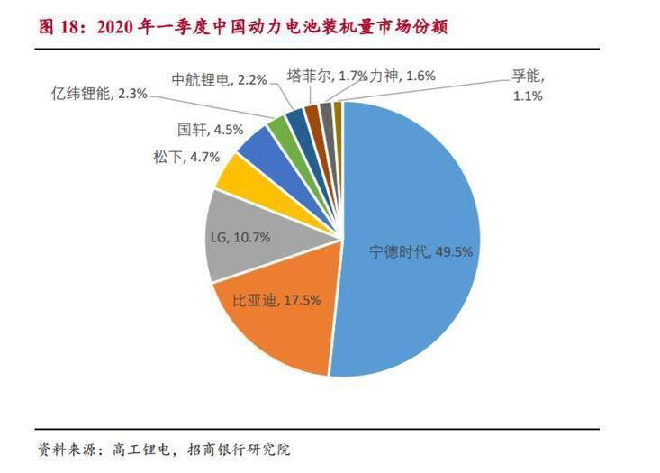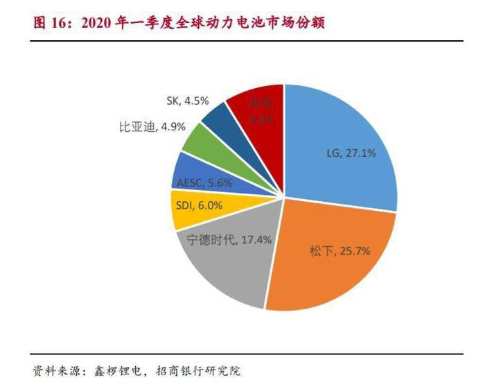 LG 占比有望繼續(xù)提升。2020 年 Q1,LG、松下、寧德時代、比亞迪全球 市場占有率分別為 27.1%、25.7%、17.4%、4.9%。LG 占有率同比增速達(dá) 153.3%,增長迅猛;松下維持其一貫的穩(wěn)健風(fēng)格,排名仍為第二,市占有率同 比小幅增長;國內(nèi)企業(yè)寧德時代、比亞迪分別位列第三、第六,下滑顯著。這 主要是由于一季度受疫情影響,國內(nèi)的新能源汽車市場跌入谷底。而歐美疫情 爆發(fā)較晚,一季度受影響較小,新能源汽車市場還出現(xiàn)一定程度的增長。