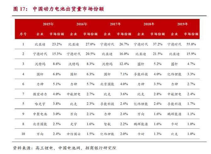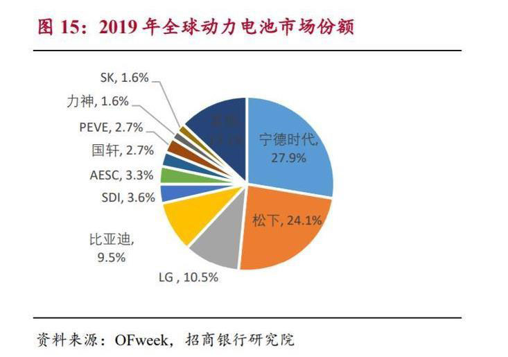 日韓企業(yè)發(fā)力,占比顯著提升。2018 年和 2019 年 CR10 分別為 81.2%、 88.9%,行業(yè)集中度持續(xù)提升,行業(yè)競爭趨于激烈。從主要國家來看,TOP10 全部來自中日韓三國。2019 年 TOP10 市場占比中,中日韓占比分別 41.8%、 31.4%、17.3%,中國市場份額呈下滑趨勢,日韓呈上升趨勢。主要是由于中 國電池企業(yè)對國內(nèi)市場依賴度較高,海外市場表現(xiàn)較佳的寧德時代, 2019 年 的電池出口額僅占營收的 5.6%。近兩年隨著歐美新能源汽車市場的快速增長, 與其深度綁定的日韓企業(yè)得到了迅速發(fā)展。從動力電池企業(yè)來看,2019 年頭 部企業(yè)寧德時代及松下競爭優(yōu)勢明顯,合計(jì)占比達(dá) 52%。但 LG 增長較快,位列第三,同比增速達(dá) 39.7%。國內(nèi)企業(yè)除寧德時代之外,整體下滑明顯,其中 比亞迪跌出前三,市占率同比下滑 27.9%,降幅顯著。