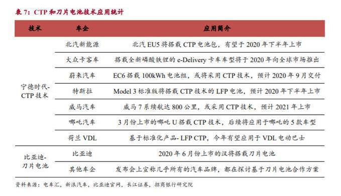 助力龍頭企業(yè)筑造技術(shù)壁壘,鞏固行業(yè)定位,拓展海外市場。寧德時代 CTP 技術(shù)知識產(chǎn)權(quán)超過 200 項(xiàng),比亞迪刀片電池技術(shù)核心專利超過 300 項(xiàng),兩 者均為龍頭企業(yè)筑造了較高的技術(shù)壁壘。寧德時代 CTP 技術(shù)有“無模組”和“大 模組” 兩種方案,其中“大模組”方案對車型的適配度較高。據(jù)不完全統(tǒng)計(jì),國 內(nèi)下半年有 5 款搭載 CTP 技術(shù)的車型上市,其中不乏明星車型 Model3 和蔚來 EC6 等,屆時有助于寧德時代進(jìn)一步提高國內(nèi)市場占有率。同時基于 CTP 技 術(shù)的磷酸鐵鋰電池在大眾卡客車型和荷蘭 VDL 車型上的應(yīng)用,將有助于寧德 時代拓展海外市場。而比亞迪刀片電池技術(shù)有助于發(fā)揮其磷酸鐵鋰龍頭企業(yè)的 優(yōu)勢,助力其挖掘新的國內(nèi)外動力電池客戶。