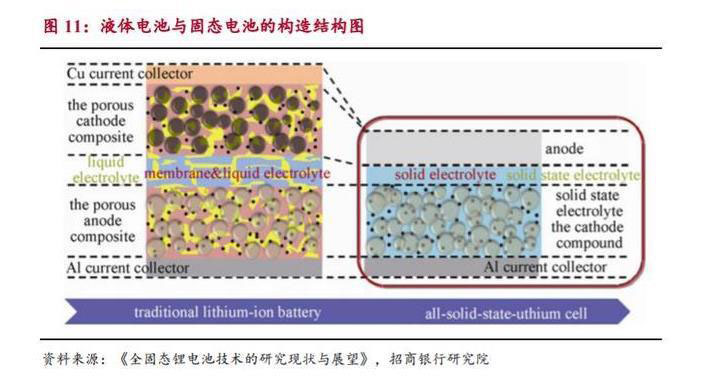 固態(tài)電池:下一代高比能鋰離子電池。目前鋰離子電池所用的電解質(zhì)為有 機(jī)電解液,因其熱分解度溫度低、易燃、有毒以及電化學(xué)窗口低,導(dǎo)致動力電 池安全性能和能量密度的提升存在一定的局限性。固態(tài)電池本質(zhì)上是用穩(wěn)定的 不燃無機(jī)固態(tài)電解質(zhì)代替易燃有機(jī)電解液,屬于材料層面(電化學(xué)體系)創(chuàng)新。