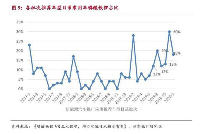 補(bǔ)貼退坡,助力磷酸鐵鋰呈現(xiàn)回暖趨勢 。2019 年 6 月份補(bǔ)貼退坡以來,整 車企業(yè)對動力電池成本要求更高,磷酸鐵鋰由于成本方面的優(yōu)勢,在低續(xù)航 (≤400km)乘用車和專用車上的搭載率有所提升。工信部新能源汽車推薦目 錄顯示,2019 年下半年搭載磷酸鐵鋰電池的車型占比明顯提升,連續(xù) 6 批占 比達(dá) 10%以上,占比平均值為 17%,遠(yuǎn)高于 2018 年的 4%,下半年磷酸鐵鋰 呈回暖趨勢。