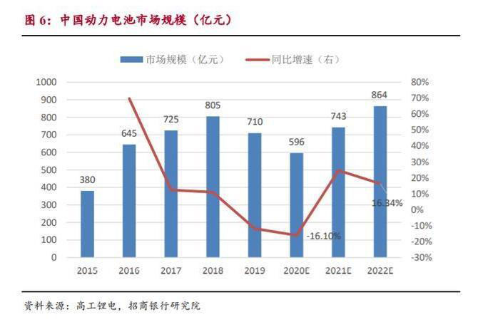 市場規(guī)模短期波動,未來仍有一定的增量空間。2019 年受限于新能源汽 車市場疲軟,動力電池市場規(guī)模有所收縮,總市場規(guī)模為 710 億元,同比下滑 11.80%。從新能源汽車銷量、單車帶電量和動力電池售價三個維度出發(fā),預(yù)計(jì) 2020 年動力電池市場規(guī)模約為 596 億元,同比增長率為-16.10%。后續(xù)隨著新 能源汽車市場的回暖,預(yù)計(jì) 2022 年市場規(guī)模有望達(dá)到 860 億元,未來 2 年復(fù) 合增長率約為 20%,仍有一定的增量空間。