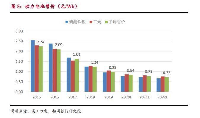 在下游整車平價訴求、上游原材料成本下降和自身制造成本下降三個維度 助力之下,動力電池售價呈現(xiàn)逐年明顯下降走勢。2019 年動力電池平均售價 為 0.99 元/Wh,同比下降 19.93%,降幅有所收窄。預(yù)計(jì) 2020 年三元、磷酸鐵 鋰電池的售價分別為 0.87、0.78 元/Wh,粗略預(yù)估動力電池平均售價為 0.84 元 /Wh 左右,同比下降 15.25%??紤]到上游原材料成本下降速率有限,預(yù)計(jì) 2022 年三元、磷酸鐵鋰電池的售價分別為 0.76、0.66 元/Wh,粗略預(yù)估動力電 池平均售價約為 0.72 元/Wh,未來 2 年的年復(fù)合增長率為-9.93%。屆時,新能 源汽車與傳統(tǒng)燃油車購車成本進(jìn)一步縮小,有望于 2025 年實(shí)現(xiàn)基本平價。