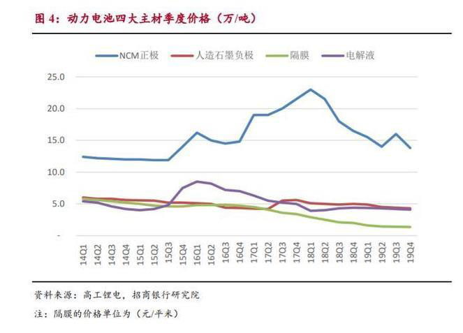 上游供給側(cè):原材料成本逐年下降,利好動力電池成本控制。動力電池上 游原材料中最重要的是四大主材:正極材料、負(fù)極材料、隔膜、電解液。隨著 中國新能源汽車市場的崛起,國內(nèi)形成了完整的動力電池原材料產(chǎn)業(yè)集群,其 中四大主材的國產(chǎn)化率均在 90%以上。經(jīng)過前期供需關(guān)系轉(zhuǎn)變和鋰鈷資源價格 波動,受益于規(guī)?;?yīng)、自動化率提高和競爭格局的加劇,四大主材的價格 呈現(xiàn)逐年下降的態(tài)勢。相較 2018 年 Q1,2019 年 Q4 正極、負(fù)極和隔膜的價格 分別下降 40.0%、15.7%、53.4%,降幅顯著。而電解液價格維持在 4 萬/噸左 右,整體上略有下降。上游供給側(cè)原材料成本的下降,利好動力電池成本控制。