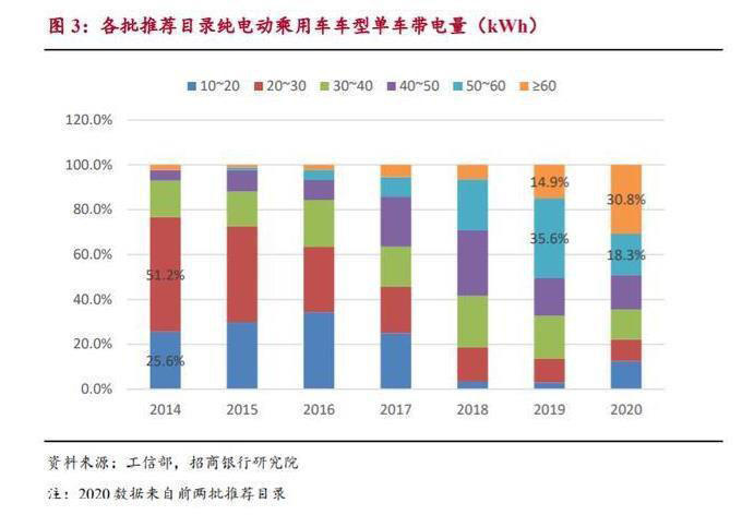 續(xù)航里程需求驅(qū)使,單車帶電量顯著提升。新能源汽車的動力來源是車載 動力電池系統(tǒng),車輛的續(xù)航里程主要由電池系統(tǒng)帶電量和百公里電耗決定。目 前提升車輛續(xù)航能力最直接的策略就是增加整車帶電量,如優(yōu)化車身結(jié)構(gòu)以增 加電池?cái)?shù)量或選配能量密度更高的動力電池。工信部公布的各批次純電動乘用 車性能參數(shù)顯示,2014 年以來單車帶電量顯著提升。2014 年大部分車型帶電 量在 20~30kWh 區(qū)間,占比為 51.2%。2019 年大部分車型帶電量在≥50kWh 區(qū) 間,接近 2014 年的兩倍。而 2020 年公示的車型中,單車帶電量≥60kWh 的車 型占比達(dá) 30.8%,相較 2019 年上升了 15.9 個百分點(diǎn),增速顯著。受益于續(xù)航 里程的持續(xù)提升,新能源汽車單車電量持續(xù)提升的趨勢短期不會改變。預(yù)計(jì) 2021 年推出的純電動乘用車中帶電量≥60kWh 車型占比有望達(dá)到 50%左右,有 利于帶動動力電池的需求。