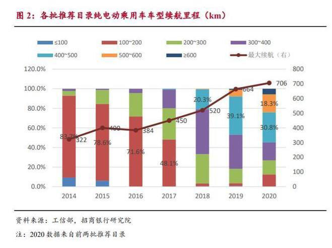 技術(shù)與政策雙驅(qū)動,續(xù)航里程顯著提升。續(xù)航里程一直以來是新能源汽車 的行業(yè)痛點(diǎn)之一,也是消費(fèi)者對新能源汽車望而卻步的主要因素之一。近年來, 隨著動力電池技術(shù)的進(jìn)步,輔以補(bǔ)貼政策的積極引導(dǎo),新能源汽車的續(xù)航里程 顯著提升。迄今為止,工信部共公布三十一批《免征購置稅的純電動乘用車車 型目錄》, 2014 年大部分車型續(xù)航里程在 100~200km,占比高達(dá) 83.7%。 2014 年以來續(xù)航里程逐年提升,最大續(xù)航里程已由 322km 提高至 706km,增 速顯著。最近三年續(xù)航里程以每年接近 100km 的速度顯著提升,2019 年公示 的大部分車型續(xù)航在 300~500km 區(qū)間,其中 400km 以上續(xù)航里程的車型占比 為 46.9% 。而 2020 年公示的兩批目錄中,大部分車型的續(xù)航里程在 400~600km,其中 400km 以上續(xù)航里程的占比為 54.8%,相較 2019 年提高了 7.9 個百分點(diǎn)。在最新公布的補(bǔ)貼方案中,已將純電動乘用車?yán)m(xù)航里程補(bǔ)貼門 檻提高至 300km。伴隨著消費(fèi)升級和行業(yè)競爭加劇趨勢,預(yù)計(jì)后續(xù)除特定應(yīng)用 場景之外,低續(xù)航里程的車型逐漸會被淘汰,高續(xù)航里程的車型占比會逐年提 升。預(yù)計(jì) 2021 年推出的純電動乘用車中續(xù)航里程在 400km 以上的車型占比可 以達(dá)到 80%左右,最大續(xù)航里程有望達(dá)到 800km 左右。
