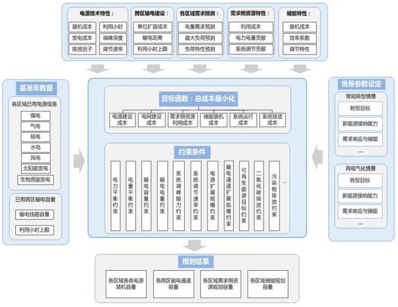 國(guó)網(wǎng)能源院能源互聯(lián)網(wǎng)研究所構(gòu)建了電力系統(tǒng)源-網(wǎng)-荷-儲(chǔ)協(xié)調(diào)規(guī)劃模型,自主開發(fā)了程序代碼,能夠?qū)σ?guī)劃期內(nèi)中國(guó)各區(qū)域各類電源、輸電通道、需求側(cè)資源、儲(chǔ)能等電力系統(tǒng)各個(gè)部分進(jìn)行統(tǒng)籌規(guī)劃,得到電力系統(tǒng)整體最優(yōu)發(fā)展路徑。求解方式為通過(guò)建立數(shù)學(xué)優(yōu)化模型,將規(guī)劃期內(nèi)各年份各區(qū)域各類源網(wǎng)荷儲(chǔ)元素的發(fā)展規(guī)模設(shè)為待求解變量,構(gòu)建目標(biāo)函數(shù)與約束條件,通過(guò)計(jì)算機(jī)編程的方式,求得一組滿足各項(xiàng)約束條件、且使得目標(biāo)函數(shù)值最小的解。