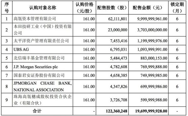 7月17日晚間,寧德時(shí)代發(fā)布公告,公布非公開(kāi)發(fā)行股票發(fā)行結(jié)果,此次募集資金總額197億元。其中高瓴資本認(rèn)購(gòu)100億元,本田認(rèn)購(gòu)37億元,具體如下圖: