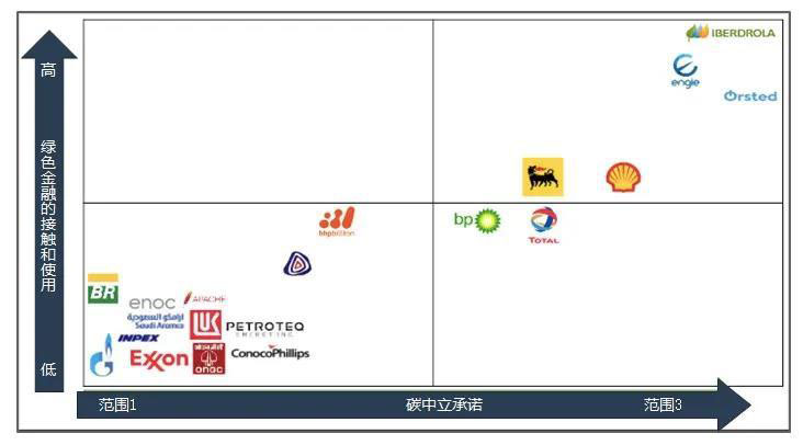 仔細(xì)觀察圖1可以發(fā)現(xiàn),碳中立承諾范圍大的公司基本集中在歐洲國家,其他國家的公司很少有想要做出改變的意向。由于強(qiáng)有力的環(huán)境政策框架,歐洲在可持續(xù)發(fā)展方面處于領(lǐng)先地位。法國Engie[6]、丹麥?rsted[7]和西班牙Iberdrola[8]幾乎成功地走上了符合《巴黎協(xié)定》目標(biāo)的脫碳道路,并承諾在2050年前實(shí)現(xiàn)碳中立。這三家公司均已開始能源多元化進(jìn)程,并都從化石燃料中撤資,轉(zhuǎn)投可再生能源。政府也助力于他們的綠色轉(zhuǎn)型,例如歐盟頒布有關(guān)環(huán)境披露的法律和強(qiáng)制性污染責(zé)任政策、制定碳排放交易體系,以及各國不斷增加可再生能源的補(bǔ)貼等。與此同時,利益相關(guān)者的參與和非政府組織對石油和天然氣巨頭的壓力,也從根本上改變了公眾對氣候變化和環(huán)境意識的看法。除上述三個案例外,其他歐洲化石燃料公司也制定了降低碳排放強(qiáng)度的目標(biāo)。此外,意大利埃尼集團(tuán)(Eni)、荷蘭皇家殼牌(Dutch Shell)、英國石油公司(BP)和英美資源集團(tuán)(Angle American)都受到歐洲環(huán)境標(biāo)準(zhǔn)的影響,采取了適宜的方法來降低碳排放強(qiáng)度[9]。