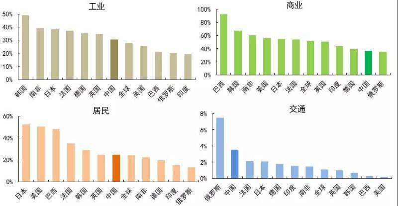 商業(yè)電氣化水平明顯高于其他部門,交通電氣化水平始終較低。分部門看,韓國工業(yè)電氣化水平“一騎絕塵”,高達49%,印度、俄羅斯工業(yè)電氣化水平落后,均約為20%;商業(yè)電氣化水平普遍較高,主要由于商業(yè)用能相對單一,電能可以滿足大部分用能需求,其中巴西是唯一超過90%的國家、高達93%,多數國家商業(yè)電氣化水平位于50%-70%;日本、美國居民電氣化水平超過50%,分別為52%、50%,俄羅斯、印度與其他國家差距明顯,居民電氣化水平僅13%、15%;交通電氣化水平始終處于較低水平,主要由于受技術和經濟性的限制,電能仍無法大范圍替代燃油。