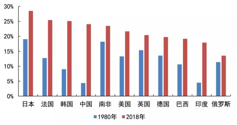 1980年,中國電氣化水平在典型國家中最低。與6個發(fā)達國家相比差距明顯,與日本差距最大,為14.7個百分點,與韓國差距最小,為4.6個百分點;與其他金磚國家亦存在差距,與南非差距最大,為13.8個百分點,與印度差距最小,為0.1個百分點。2018年,中國電氣化水平已超過多數典型國家。發(fā)達國家中,中國電氣化水平分別高于德國、英國、美國4.3、3.6、2.4個百分點,但仍分別低于日本、法國、韓國4.4、1.4、1.0個百分點;金磚國家中,中國僅低于南非0.6個百分點,已分別超過俄羅斯、印度、巴西10.5、6.1、4.9個百分點。