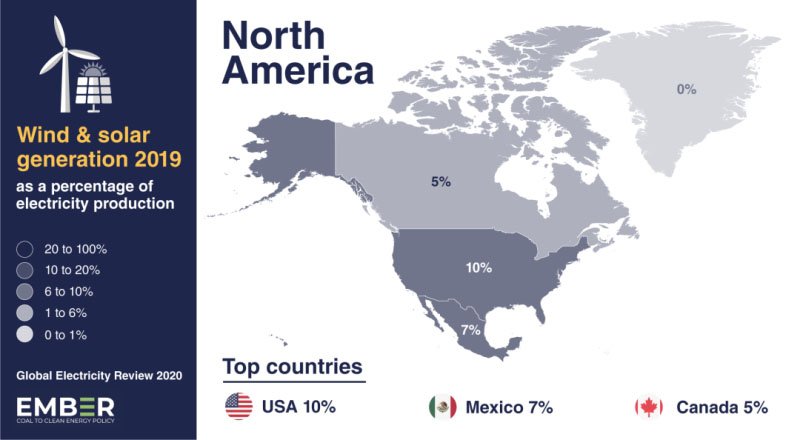 美國(guó)2019年風(fēng)能和太陽(yáng)能發(fā)電量占總發(fā)電量的10%、墨西哥7%、加拿大5%。墨西哥建設(shè)新風(fēng)能和太陽(yáng)能的速度最快,自2016年以來(lái)所占比例已經(jīng)翻了一番。盡管擁有豐富的風(fēng)能開發(fā)自然資源,但加拿大的份額最低,增長(zhǎng)最慢。在北美,風(fēng)力發(fā)電比太陽(yáng)能發(fā)電更為普遍。2019年,風(fēng)力發(fā)電的發(fā)電量是太陽(yáng)能發(fā)電量的三倍。