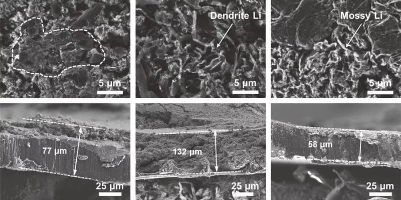 圖3. Li | SPAN全電池在0.5 C倍率下循環(huán)50圈后的金屬鋰負(fù)極正面SEM照片:(a)mixed-DIPE;(b)EC/DEC;(c)DOL/DME,以及斷面SEM照片:(d)mixed-DIPE;(e)EC/DEC;(f)DOL/DME。