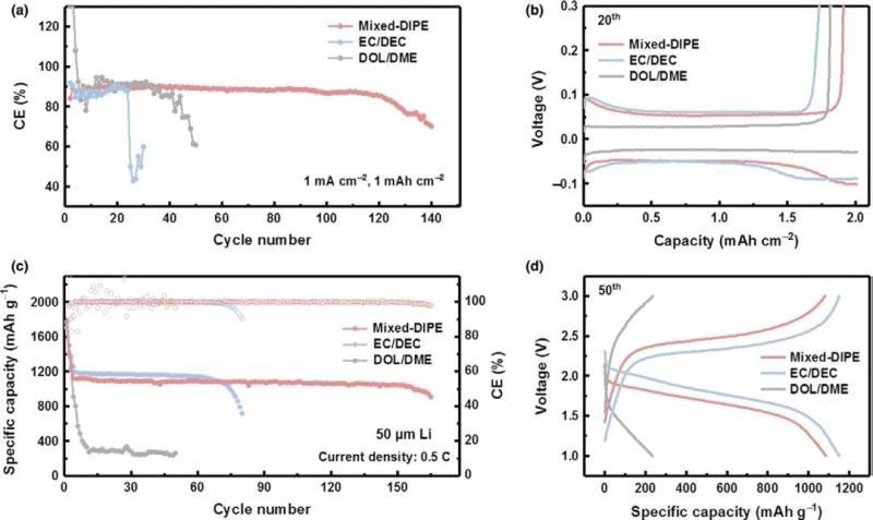 通過(guò)Li | Cu半電池及Li | SPAN全電池的循環(huán)性能可以看出,mixed-DIPE電解液能夠有效延長(zhǎng)電池的循環(huán)壽命。使用mixed-DIPE電解液的Li | Cu半電池可以穩(wěn)定循環(huán)120圈,是使用EC/DEC電解液電池壽命的五倍。而在以50 μm金屬鋰為負(fù)極的Li | SPAN全電池中,使用mixed-DIPE電解液可以將電池循環(huán)壽命延長(zhǎng)一倍,并且保持接近100%的庫(kù)倫效率,容量保持率為91.4%。