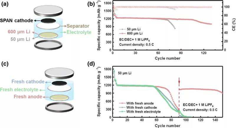 圖1. (a)使用不同厚度金屬鋰負(fù)極的Li | SPAN電池構(gòu)型示意圖;(b)使用不同厚度金屬鋰負(fù)極的Li | SPAN電池在EC/DEC電解液中的循環(huán)性能;(c)模型實(shí)驗(yàn)示意圖:使用厚度為50 μm金屬鋰負(fù)極的Li | SPAN電池循環(huán)至失效后拆開,重新匹配新負(fù)極、新正極或者新電解液;(d)失效電池在匹配新負(fù)極、新正極或新電解液后的循環(huán)性能圖。