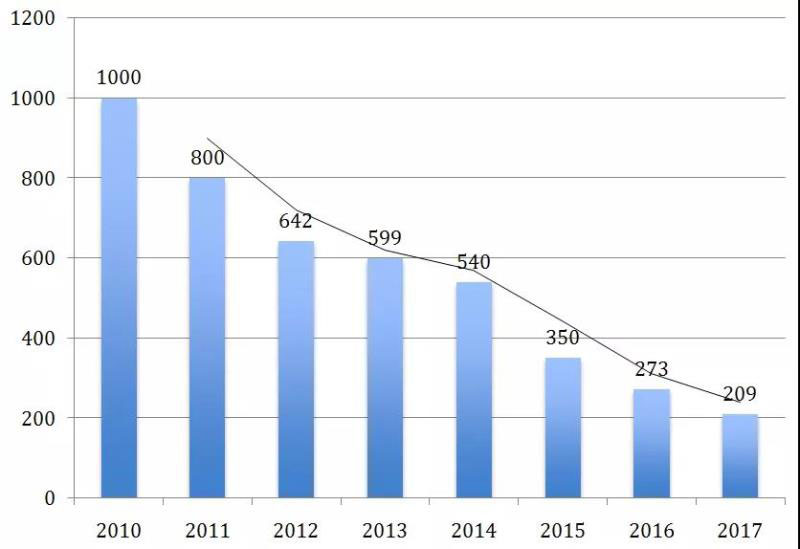 圖4 2010~2017年鋰離子電池價格(單位:美元/千瓦時)