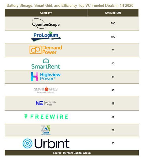 2020年上半年的前5大風(fēng)投融資交易如下:QuantumScape籌集了2億美元,ProLogium Technology籌集了1億美元,Demand Power Group獲得了7,100萬(wàn)美元,Highview Power獲得了4,600萬(wàn)美元,Nanotech Energy獲得了2,800萬(wàn)美元。