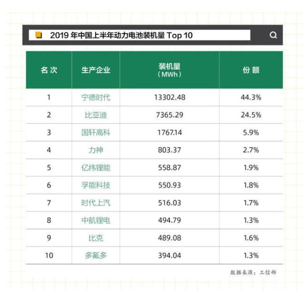 同時(shí),動(dòng)力電池企業(yè)排行榜頭部結(jié)構(gòu)也發(fā)生了變化,從2019上半年寧德時(shí)代(44.3%)和比亞迪(24.5%)的雙雄會(huì),變成寧德時(shí)代(48.7%)、LG化學(xué)(14.2%)、比亞迪(14.2%)的三足鼎立。