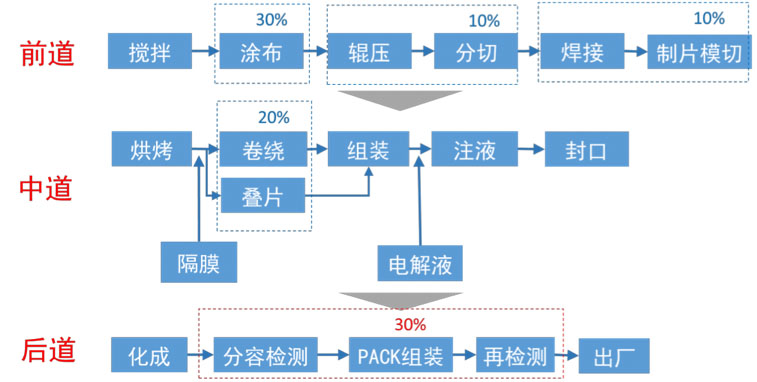 電芯的制造工序分為三段:極片制作(前段),電芯組裝(中段)、化成封測(cè)(后段)。