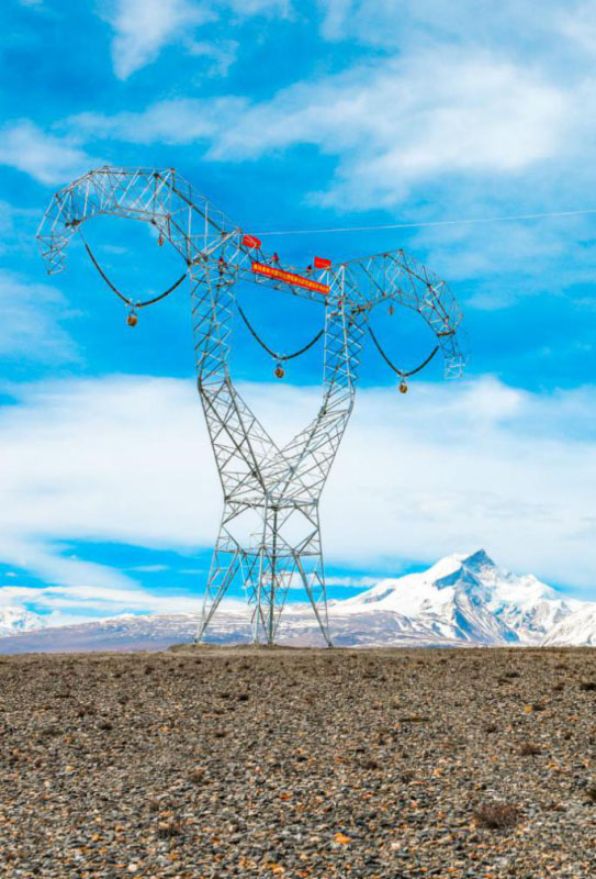 在喜馬拉雅山脈中段的日喀則市吉隆縣境內(nèi),阿里聯(lián)網(wǎng)工程8基連片“崗巴羊頭”造型輸電鐵塔巍峨屹立。