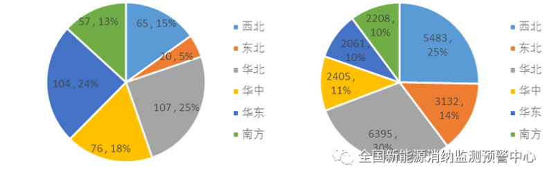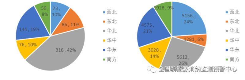 二季度各區(qū)域新增(左)、累計(右)并網(wǎng)光伏發(fā)電裝機(萬千瓦)