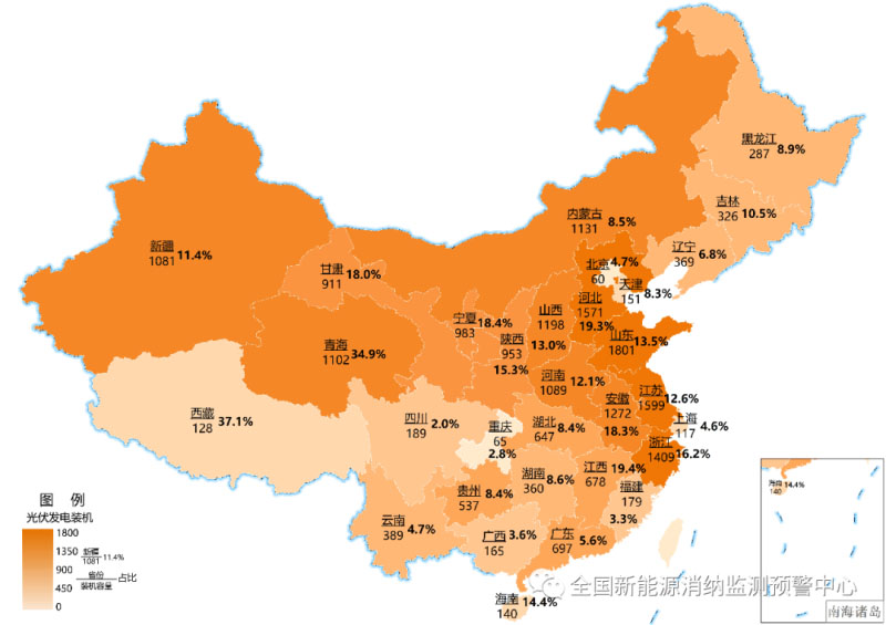 截至6月底各地區(qū)累計光伏發(fā)電裝機(萬千瓦)及占本地區(qū)總裝機比重
