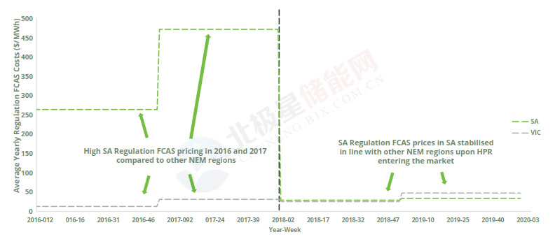 5. 在將該儲(chǔ)能項(xiàng)目引入調(diào)頻輔助服務(wù)市場(chǎng)后,南澳大利亞州發(fā)電機(jī)的年平均調(diào)頻輔助服務(wù)成本從最高的470美元/MWh降至不到40美元/MWh,并保持到目前的水平,大大節(jié)省了南澳大利亞州的能源成本。