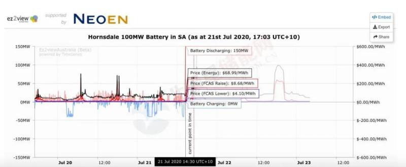 當(dāng)?shù)貢r(shí)間7月21日下午2點(diǎn)21分左右,被稱為“霍恩斯代爾電力儲(chǔ)能項(xiàng)目”的電池儲(chǔ)能系統(tǒng),向南澳大利亞電網(wǎng)供電150MW、實(shí)現(xiàn)滿負(fù)荷運(yùn)行,創(chuàng)下了新的世界紀(jì)錄。根據(jù)儲(chǔ)能系統(tǒng)所有者Neoen的聲明,這代表了該電池系統(tǒng)的儲(chǔ)能功率和容量已提高了50%、達(dá)到該儲(chǔ)能系統(tǒng)的最大發(fā)電能力。