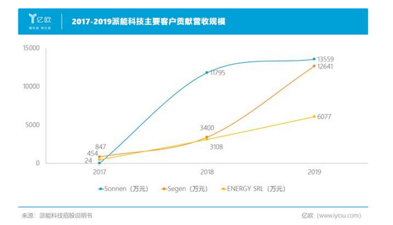派能科技比動力電池選手更早進入儲能市場,本身就意味著巨大的先發(fā)優(yōu)勢。當前,它已經(jīng)是歐洲第一大儲能系統(tǒng)集成商Sonnen、英國最大光伏銷售商Segen等海外優(yōu)質(zhì)客戶多年核心供應商。它們每年合作規(guī)模還在穩(wěn)定增長。例如,2017年其從Sonnen獲得的產(chǎn)品銷售額為24萬元,至2019年已攀升至近1.4億。其與Segen合作規(guī)模,亦從847萬升至1.3億。