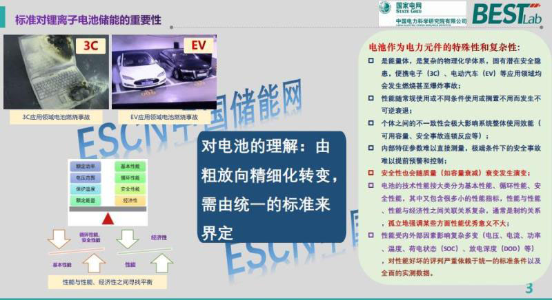 說到鋰離子電池儲能,就要說到電池這一塊,首先我要強調(diào)電池本身的問題。我們搞電力系統(tǒng)的,可能之前接觸的都是電力電子設(shè)備更多一些,但實際上電池進入到電力系統(tǒng)以后,跟以往的這些物理設(shè)備還真是不一樣,實際上它作為一個電力元件,是一個具有非常復(fù)雜性和特殊性的東西。鋰離子電池在3C和電動汽車應(yīng)用領(lǐng)域,大家經(jīng)??吹桨l(fā)生燃燒或者爆炸事故,大家可能習(xí)以為常,認為它就是這樣的。但是我有不同的看法,剛剛出臺一個電動汽車動力電池安全強制標準,我覺得這個標準可能不是從用戶的角度去做的標準,因為它對電池的要求是給5分鐘的逃生時間。這種標準如果延伸到儲能領(lǐng)域的話,是不可想象的。先不說韓國燒了這么多電站,就說國內(nèi)如果燒幾個站,在電網(wǎng)側(cè)燒幾個站,我估計沒人再敢用這個東西,所以在我們儲能的標準里面,嚴格的要求就是電池本體不能起火,不能爆炸。而且從技術(shù)上來說是有選擇的,有技術(shù)路線選擇的。所以說安全是電池的一個特殊性,它是一個能量體,它本身就有安全隱患。