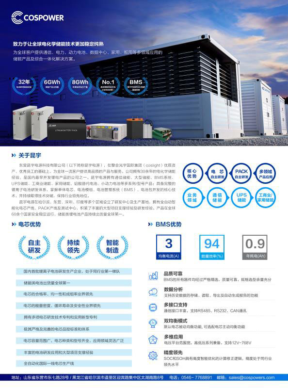 昆宇電源成立于2019年,公司繼承了光宇集團30余年的技術沉淀和市場積累,是國內最早開發(fā)鋰電產品的公司,致力于讓電化學儲能技術更加穩(wěn)定純熟,為全球客戶提供通信、電力、動力、數據中心、家用、船用等多領域應用的儲能產品及綜合一體化解決方案。公司擁有豐富的技術儲備,通信基站儲能系統(tǒng)、新能源動力電池系統(tǒng)、大型電力儲能系統(tǒng)(BESS)、大數據能源監(jiān)控系統(tǒng)(EMS)、IDC UPS用鋰電池全產品技術水平位居全球領先地位。