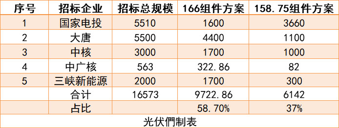 另一方面,除了上述因生產(chǎn)成本導(dǎo)致的供貨問題之外,高效產(chǎn)能供應(yīng)能力也是下半年搶裝的一大隱憂。光伏們統(tǒng)計(jì)了五家電力央企的組件集采情況,其中166組件方案占比將近60%,加上后續(xù)的華電、華能等招標(biāo),166的占比預(yù)計(jì)將超過60%。