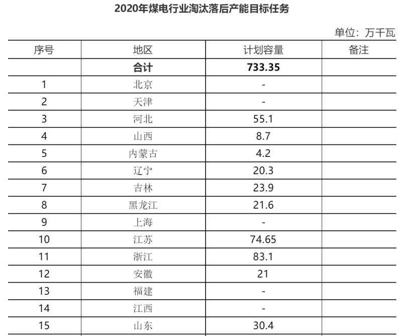 國(guó)家能源局發(fā)布關(guān)于下達(dá)2020年煤電行業(yè)淘汰落后產(chǎn)能目標(biāo)任務(wù)的通知稱,2020年全國(guó)計(jì)劃淘汰落后產(chǎn)能合計(jì)733.35萬千瓦。淘汰機(jī)組中,凡屬未建成機(jī)組、2015年1月1日后無運(yùn)行記錄機(jī)組,不計(jì)入煤電行業(yè)淘汰落后產(chǎn)能目標(biāo)任務(wù)。列入本年度煤電行業(yè)淘汰落后產(chǎn)能目標(biāo)任務(wù)的煤電機(jī)組,除明確作為煤電應(yīng)急備用電源的機(jī)組外,須在2020年12月底前完成拆除工作。對(duì)于未納入國(guó)家年度淘汰落后產(chǎn)能目標(biāo)任務(wù),已停運(yùn)多年、短期內(nèi)不具備恢復(fù)生產(chǎn)條件的“僵尸”煤電機(jī)組,各地要結(jié)合實(shí)際情況,推動(dòng)企業(yè)盡快完成淘汰關(guān)停工作。