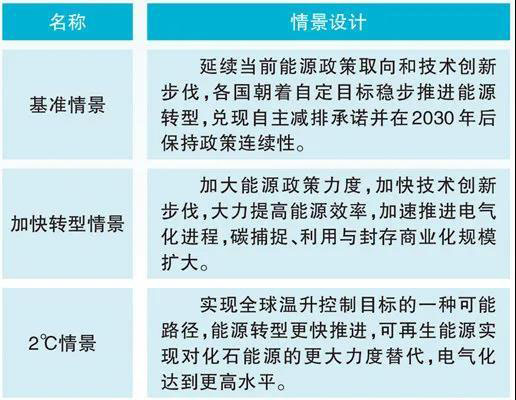 在經(jīng)濟(jì)發(fā)展、人口增長預(yù)期的基礎(chǔ)上,考慮能源政策、技術(shù)進(jìn)步等方面發(fā)展趨勢(shì),面向2050年設(shè)計(jì)了基準(zhǔn)、加快轉(zhuǎn)型、2℃三個(gè)情景。