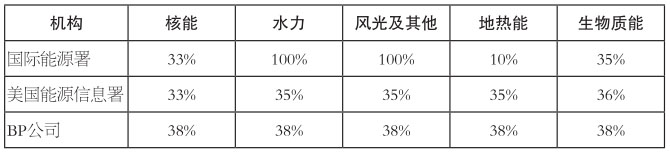 在折算系數(shù)方面,三家機構(gòu)統(tǒng)計方法的差異并不在煤炭、石油、天然氣等化石能源,而是在核能、可再生能源。因為前者的能量含量相對容易測量,且能源供給消費鏈也相對容易追蹤;后者的一次能源量要么難以直接測量得到,要么無法追蹤其產(chǎn)業(yè)鏈,通常的做法是首先獲得這些能源所產(chǎn)生的電能,然后除以折算系數(shù)得到標準單位的一次能源量,而差異主要就在于各機構(gòu)采用了不同的折算系數(shù)。在國際能源署的統(tǒng)計中,核能折算系數(shù)的33%為典型核電站蒸汽發(fā)生器的假定效率;水能、風能、太陽能及其他能源(如潮汐能)采用了“捕獲能源”的思路,即只統(tǒng)計所發(fā)電力的能源含量,或稱“電熱當量法”;地熱能折算系數(shù)為10%,體現(xiàn)了其較低的轉(zhuǎn)換效率;生物質(zhì)能選用35%,因其具有與化石能源相同的可燃性。在美國能源信息署的統(tǒng)計中,核能折算系數(shù)與國際能源署相同,為33%;水能、風能、太陽能、地熱能等不可燃可再生能源選用了“化石燃料等效法”,折算系數(shù)為35%;生物質(zhì)處理方式與國際能源署類似,但折算系數(shù)略高,為36%。在BP公司的統(tǒng)計中,核能、可再生能源的折算系數(shù)均選用38%,為經(jīng)合組織國家火力發(fā)電效率的平均值,全部采用“化石燃料等效法”。