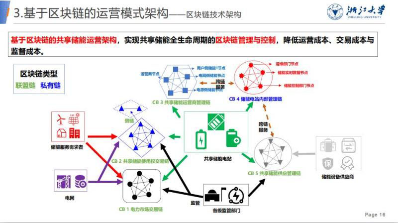 這就是整個運營架構,因為剛才說了,它是一個分布式的賬本。共享儲能有多個業(yè)務,所以有很多區(qū)塊鏈網(wǎng)絡,很多節(jié)點。比如說電力市場交易的聯(lián)盟鏈,共享儲能使用權的交易鏈,共享儲能運營商的管理鏈,儲能電站內部的管理鏈,還有共享儲能供應的管理鏈等等,會建很多節(jié)點,節(jié)點相當于一個數(shù)據(jù)庫,也就是多方共享一個數(shù)據(jù)庫。原來就是在電網(wǎng)公司的數(shù)據(jù)庫或者儲能管理系統(tǒng)的數(shù)據(jù)庫,現(xiàn)在共享在一起,每個人都有訪問權限。通過這樣的話,我們來對區(qū)塊鏈進行管理和控制,從而降低運營成本和交易成本,還有一些監(jiān)督成本。