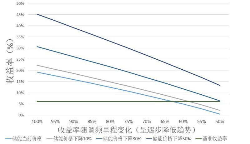 這個(gè)是針對(duì)目前新政情況下儲(chǔ)能輔助調(diào)頻的一個(gè)項(xiàng)目的經(jīng)濟(jì)性分析,因?yàn)樽罱鼜V東省出臺(tái)一個(gè)政策,正在征求意見,要在8月1號(hào)實(shí)施。首先KP值的算法變了,大概收入要減少30—40%,每年的里程數(shù)還會(huì)繼續(xù)削減?;谶@個(gè)最惡劣的情況,我做了一個(gè)估算,結(jié)果發(fā)現(xiàn)還行,這個(gè)類型的儲(chǔ)能項(xiàng)目還可以繼續(xù)做。投資回收期可能由不到兩年變成五年左右,隨著目前電池技術(shù)不斷發(fā)展和控制策略不斷優(yōu)化,把一個(gè)儲(chǔ)能電站用到五年是完全沒有問題的,如果運(yùn)維水平高的話,也許四年就成本回收了。