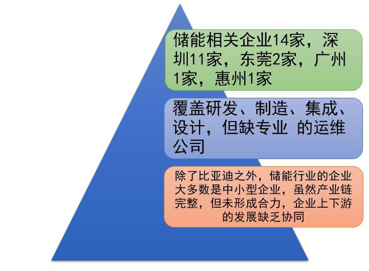 最后介紹一下廣東的儲(chǔ)能產(chǎn)業(yè),這也是不完全統(tǒng)計(jì)。廣東省的儲(chǔ)能產(chǎn)業(yè)鏈還是挺完整的,上規(guī)模的一共有十幾家,覆蓋了研發(fā)、制造、集成、設(shè)計(jì),但是缺乏專業(yè)的運(yùn)維公司,這不僅是廣東的情況,全國的情況都是缺乏專業(yè)的運(yùn)維公司,大家重建設(shè)輕運(yùn)維,會(huì)導(dǎo)致項(xiàng)目后期收益不好。
