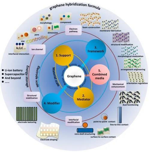 圖1. 石墨烯與硅及其他高容量?jī)?chǔ)能電極材料的雜化方法和策略