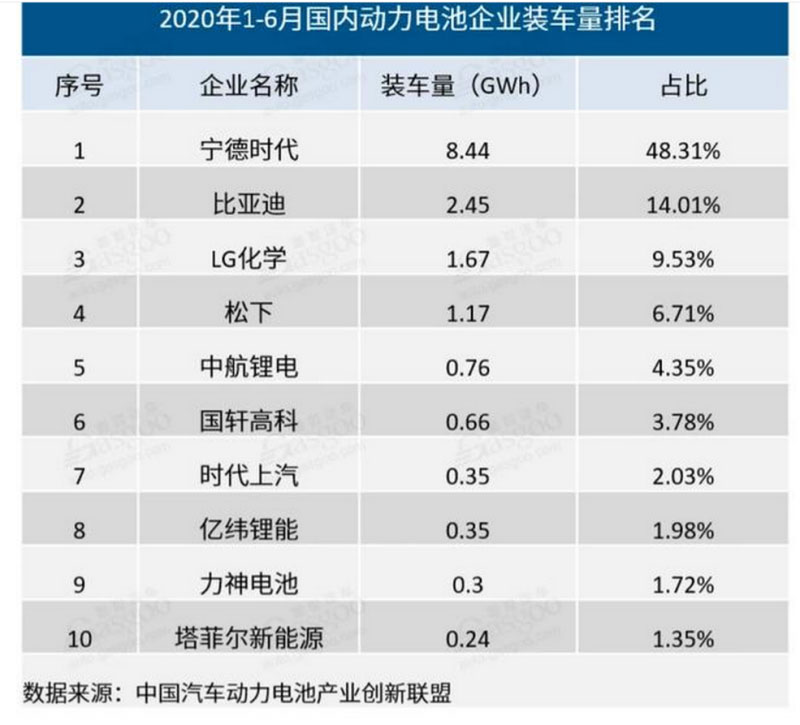 根據(jù)動(dòng)力電池產(chǎn)業(yè)創(chuàng)新聯(lián)盟數(shù)據(jù),2020年上半年,裝機(jī)量Top10企業(yè)占據(jù)了動(dòng)力電池93.77%的市場(chǎng)份額。寧德時(shí)代占比近半,達(dá)到48.31%;比亞迪占據(jù)14.01%;在動(dòng)力電池“白名單”取消后,外資品牌LG化學(xué)、松下卷土重來(lái),分別占據(jù)9.53%、6.71%的市場(chǎng)份額;剩余不到30%由中航鋰電、國(guó)軒高科等企業(yè)瓜分。
