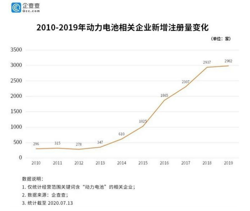 企查查數(shù)據(jù)顯示,截至2020年7月,我國(guó)動(dòng)力電池相關(guān)企業(yè)共有近1.3萬(wàn)家。2016年增速最快,全年新增注冊(cè)量1865家,同比增長(zhǎng)81.95%。2018年、2019年新增注冊(cè)量均近3000家。