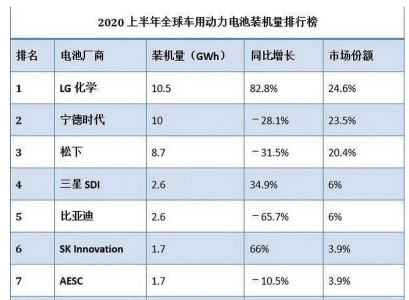 8月3日,韓國市場調(diào)研機(jī)構(gòu)SNE Research發(fā)布的最新數(shù)據(jù)顯示,受疫情影響,今年上半年,全球車用動(dòng)力電池總裝機(jī)量同比大跌23%,至42.6 GWh。其中,LG化學(xué)以24.6%的市場份額排名第1,而寧德時(shí)代排名第2,松下排名第3。從地區(qū)來看,中國市場在下滑,而歐洲市場在崛起。