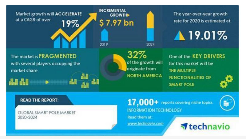據(jù)Technavio發(fā)布了最新的標(biāo)題為“ 2020-2024年全球智能桿市場”的市場研究報(bào)告,預(yù)計(jì)2020-2024年,全球智能桿市場規(guī)模預(yù)計(jì)將增長79.7億美元。