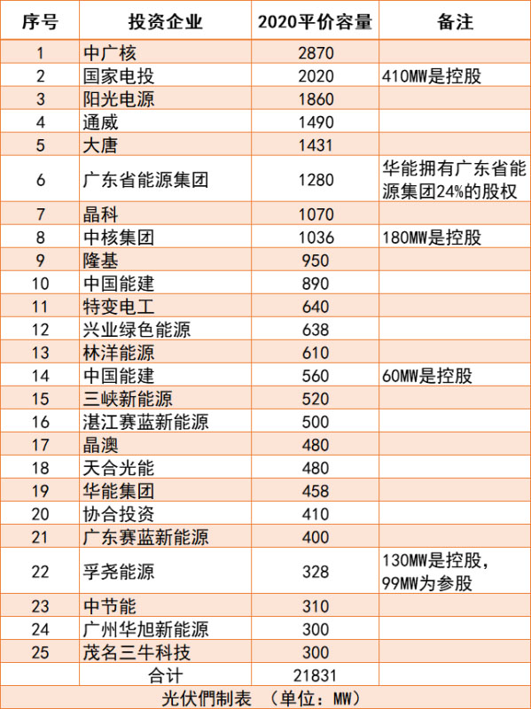 根據(jù)項(xiàng)目名單,光伏們梳理了單體規(guī)模1MW以上平價(jià)光伏項(xiàng)目的最高級(jí)母公司信息,項(xiàng)目所涉企業(yè)超過(guò)160家,下圖為T(mén)OP 40的項(xiàng)目以及業(yè)主信息。40家企業(yè)總裝機(jī)規(guī)模23.39GW,占全部平價(jià)光伏項(xiàng)目容量的68%。相比2019年,2020年平價(jià)項(xiàng)目投資企業(yè)的集中度顯著降低。