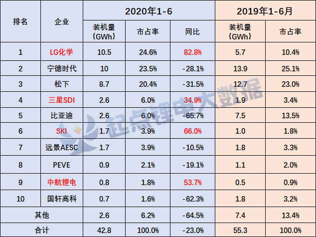 Top10企業(yè)中,只有LG化學(xué)、三星SDI、SKI和中航鋰電逆勢(shì)生長(zhǎng),裝機(jī)量同比增長(zhǎng),其余6家企業(yè)裝機(jī)量均出現(xiàn)不同程度下滑。