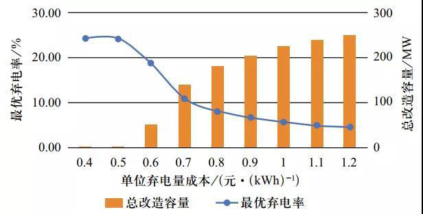 在不同單位棄風(fēng)成本下,計算獲得廣義成本最小時的火電機(jī)組改造總?cè)萘亢拖到y(tǒng)棄電率(下稱“最優(yōu)棄電率”),結(jié)果如圖3所示。由圖可知,當(dāng)單位棄電成本大于0.5元/kWh時,靈活性改造容量為正,說明靈活性改造能夠減少廣義成本。
